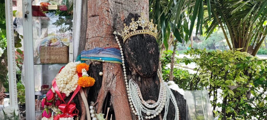 บอกกี่ครั้ง ช่างก็ได้แต่รับปากว่า ครับ ๆ พี่สาวรามอินทรา2567 แต่ก็ยังไม่ตัดออกสักที กระทั่งวันหนึ่งช่างต้องขอให้คุณเอกเดินไปดูกับตาแล้วบอกว่า “มีคนมาอยู่แล้วครับ” ต้นโพธิ์ต้นเดิมเติบโตขึ้นแต่ส่วนรากนั้นมีรูปร่างคล้ายหุ่นคนแทรกตัวอยู่ ระหว่างนั้นทีมช่างก็เล่าถึงสิ่งที่พบเจอ คือเห็นภาพผู้หญิงชุดขาวเดินไปมา ทำให้ไม่มีช่างคนใดกล้าตัด เมื่อขอให้ถูกหวยก็ปรากฏว่าถูกจริงหลายงวดกันทุกคน จึงเรียกรากโพธิ์คล้ายคนนี้ว่าเจ้าแม่