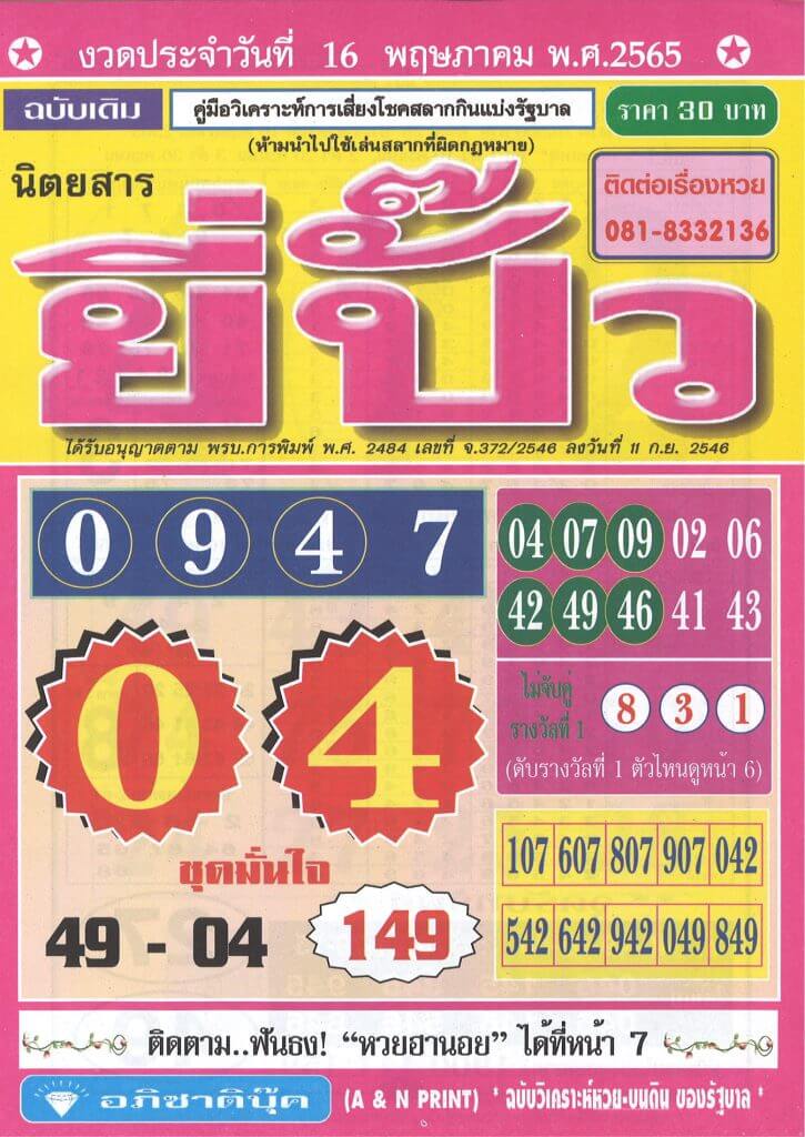 หวยยี่ปั๊ว 16/5/65