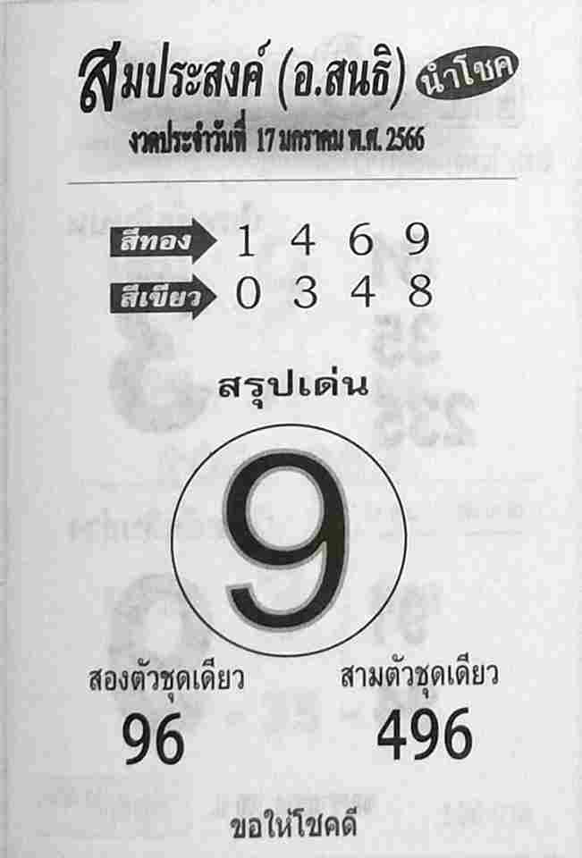 ส่วน หวยสมประสงค์ 17-1-66 ที่เรา สรุป วิเคราะห์เลขต่างๆ ที่น่าสนใจ ได้ที่นี่